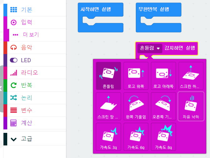 각각의 이벤트에 맞게 '가속도 센서 감지하면 실행', 'LED 출력' , '라디오 전송 문자열' 블록을 이용하여 블록코딩을 한다. 실제 동작을 해보면 반응이 느리다. LED 출력 블록의 갱신 주기(400ms)가 있어서다. 반을을 빠르게 하려면 갱신 주기를 0 또는 LED 출력을 사용하지 말이야 한다. 블록 편집기에서는 할 수 없기 때문에, 그 부분은 자바스크립트 편집기에서 추가하여 갱신 주기를 0으로 만든다.