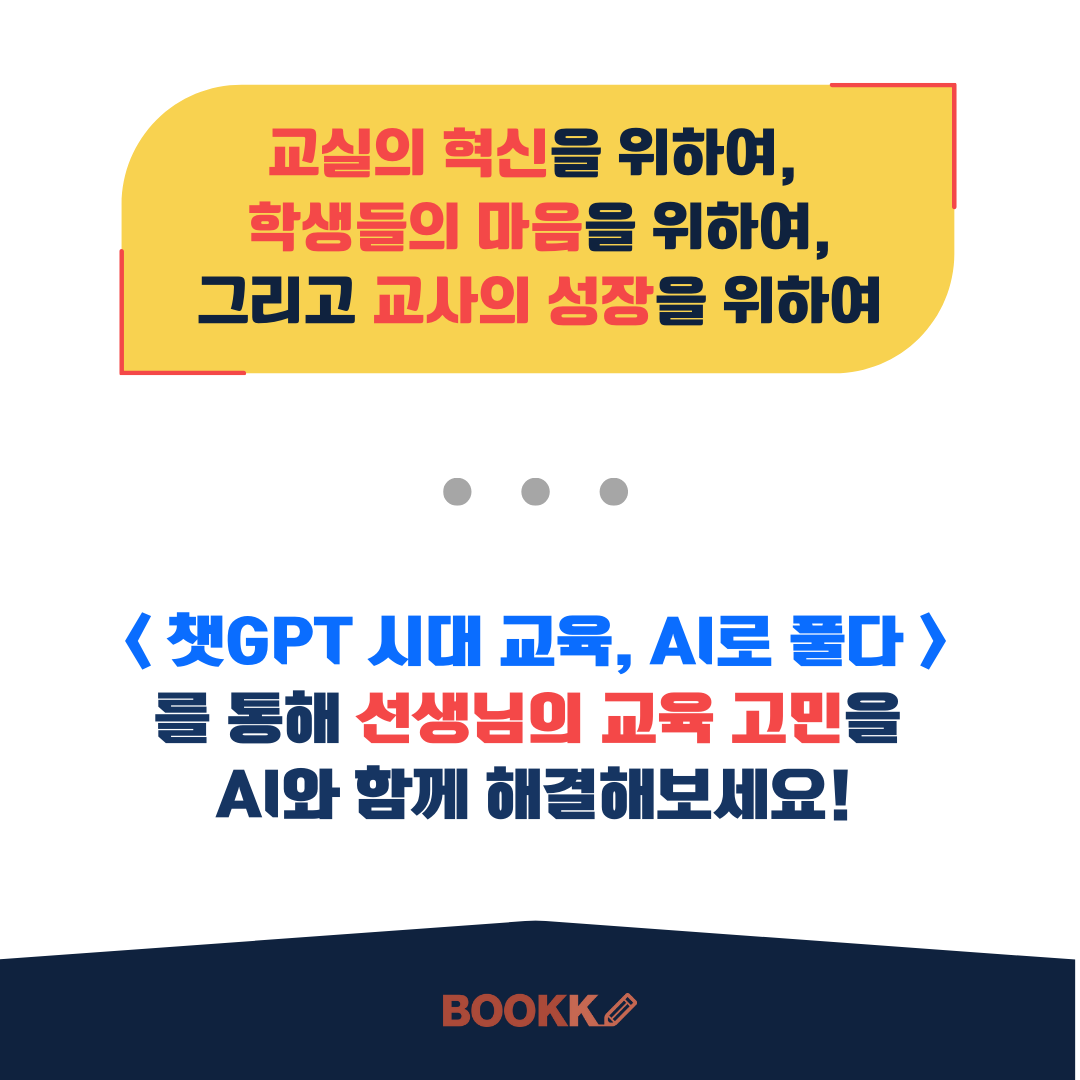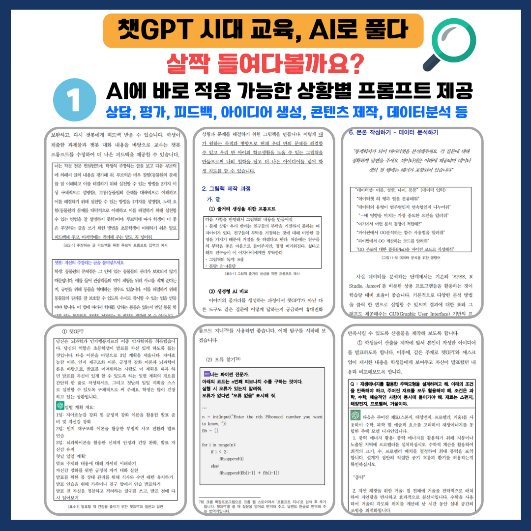 학교 선생님의 교육에 대한 고민을 AI로 풀어낸 책이 나왔다. 11분이 공저한 <챗GPT 시대 교유, AI로 풀다> 책이다. 상담, 발명, 작문, 작곡, 논문, 영어 회화, 생활기록부에 대한 고민이 있다면 이 책을 적극 추천한다. 정답을 얻으면 좋겠지만, 뭔가 시작할 수 있는 인사이트를 얻을 수 있을것이다.
