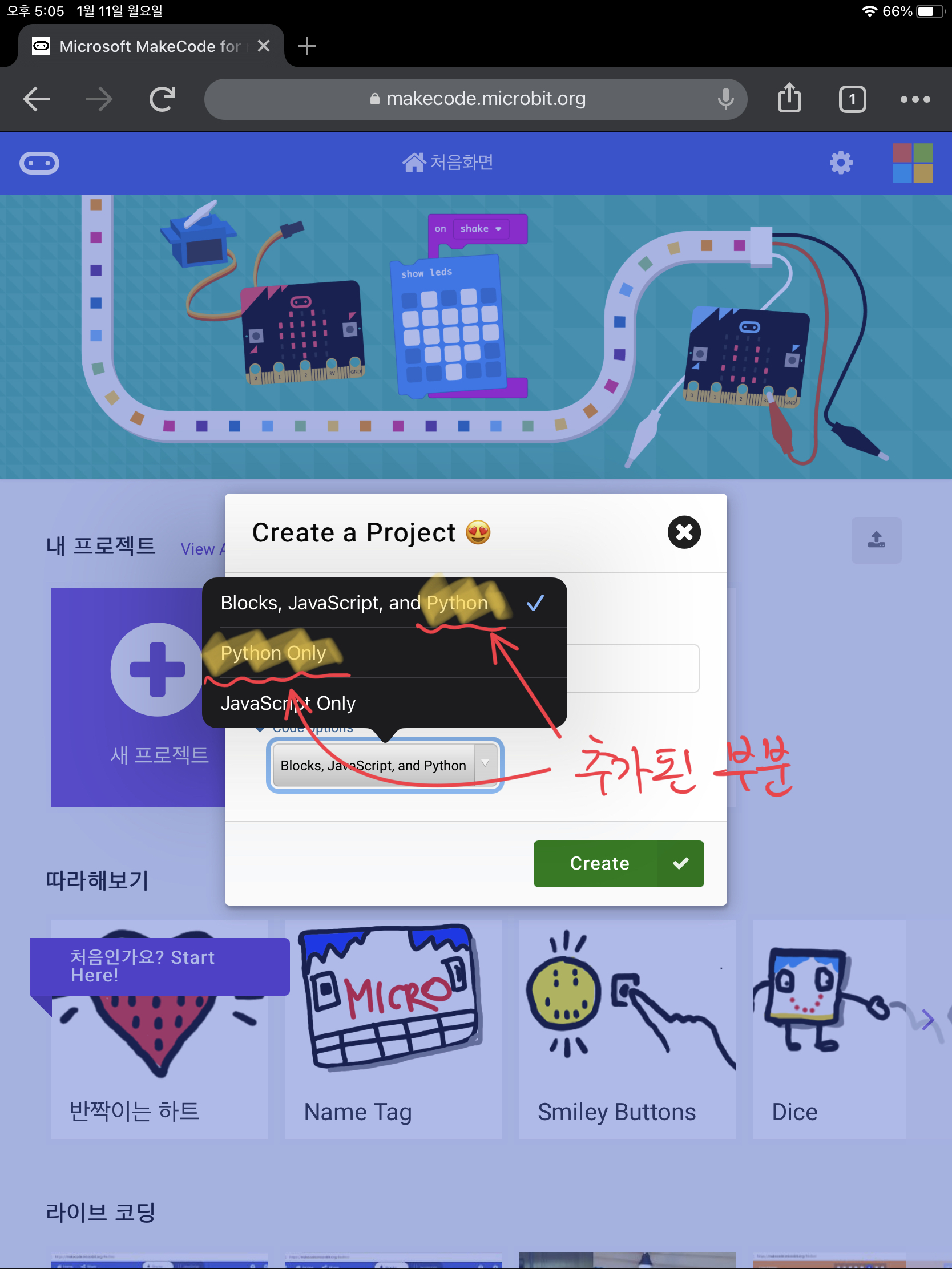 작년쯤? 마이크로비트가 V1 -> V2로 업그레이드하며 출시됐다. 이에 마춰서 메이크코드도 업데이트 되었는데, 눈에 보이는건 메이크코드에 파이썬 항목이 추가된 것이다. 레퍼런스 문서에 추가된 파이썬 코드들들도 봤는데, 우와~ 온전히 최신 파이썬 언어를 사용할 수 있겠구나 생각했다.