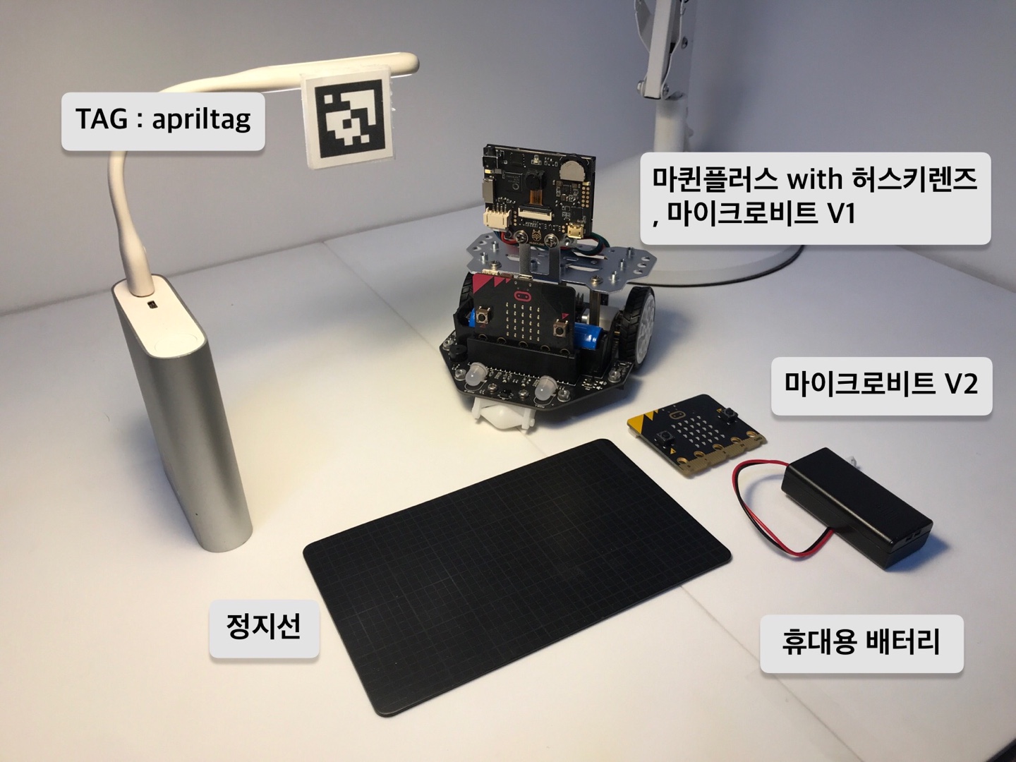 허스키렌즈에서 인식 할 수 있는 TAG는 apriltag중 tag36h11이다. 어느 정도의 흰색 바탕이 필요하다. 프린터로 출력하여 여백을 충분히 주고 자른다. 사진에서는 TAG를 고정하기 위해 샤오미 배터리와 USB LED램프롤 사용 했다. TAG를 고정할 수 있는 것이면 어떤것이든 좋다.