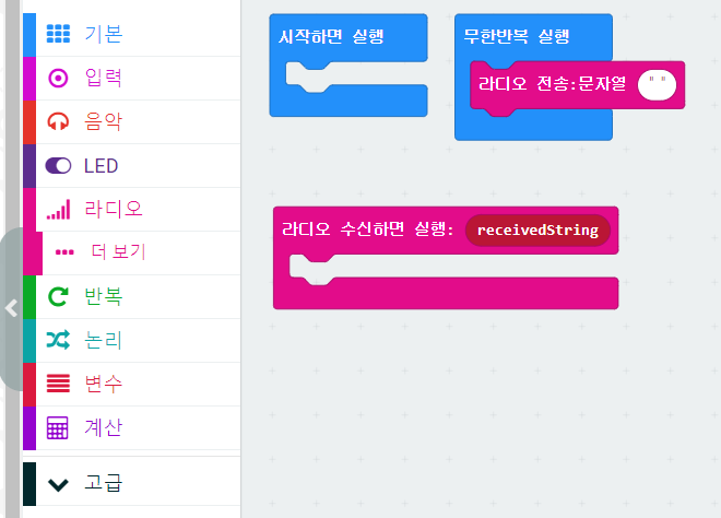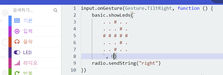 각각의 이벤트에 맞게 '가속도 센서 감지하면 실행', 'LED 출력' , '라디오 전송 문자열' 블록을 이용하여 블록코딩을 한다. 실제 동작을 해보면 반응이 느리다. LED 출력 블록의 갱신 주기(400ms)가 있어서다. 반을을 빠르게 하려면 갱신 주기를 0 또는 LED 출력을 사용하지 말이야 한다. 블록 편집기에서는 할 수 없기 때문에, 그 부분은 자바스크립트 편집기에서 추가하여 갱신 주기를 0으로 만든다.
