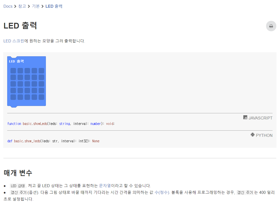 'LED 출력' 블록을 추가하여 화살표를 그린 후 자바스크립트 편집창에서 ', 0'을 추가하여 LED 표시 갱신 주기를 0으로 만든다.