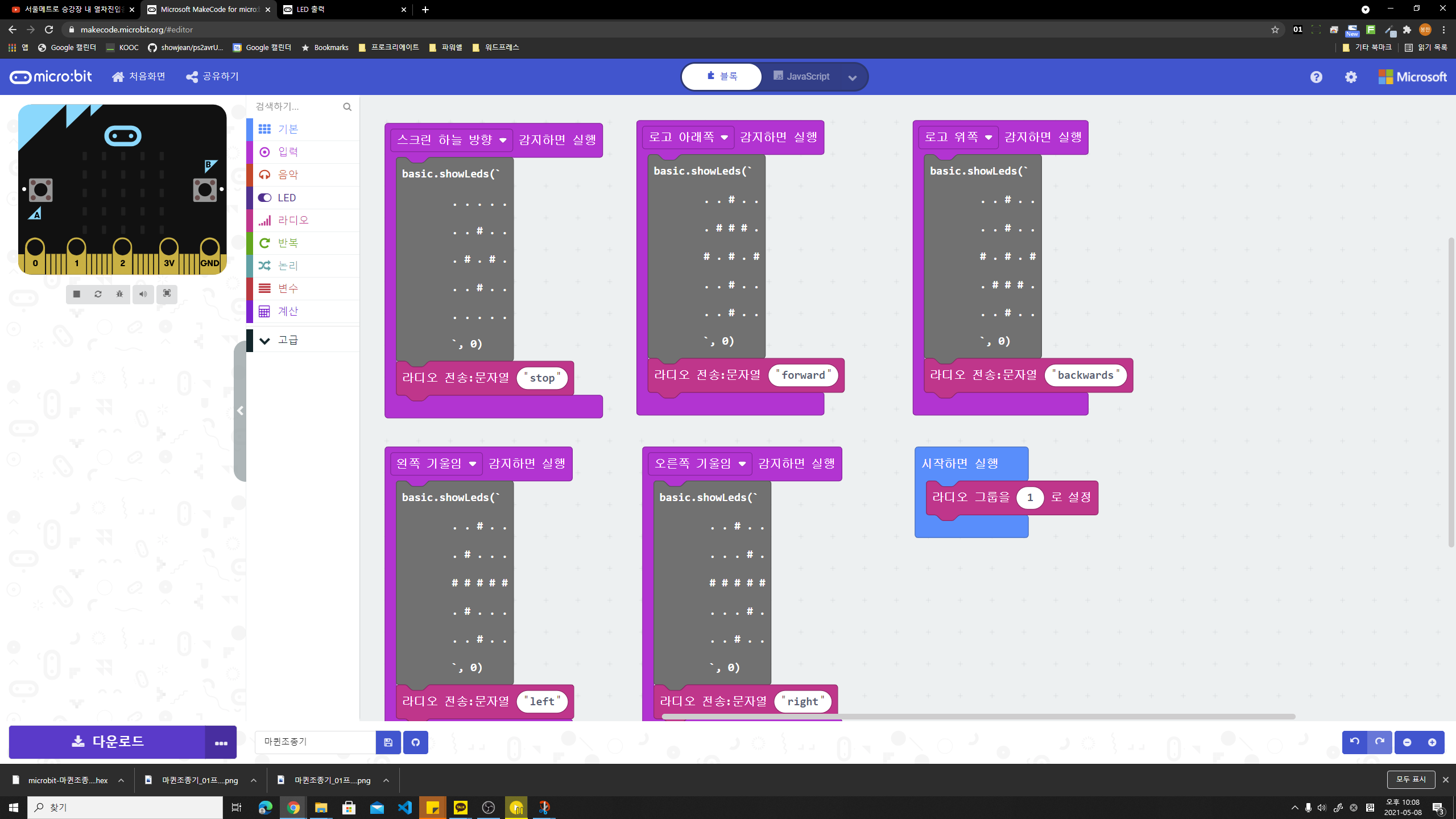 마이크로비트 시뮬레이터로 테스트를 한다. 이상 없이 화살표가 표시 되면 마이크로비트에 다운로드를 한다.