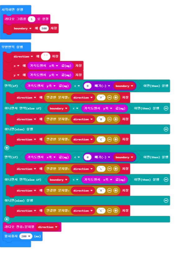 FC(앞으로) , FL(왼쪽 앞으로), FR(오른쪽 앞으로), CL(외쪽), BL(왼쪽 뒤로), BC(뒤로), BR(오른쪽 뒤로), CR(오른쪽), CC(정지) 9가지 동작(제스처)에 맞게 R/C CAR에서 구현해 주면 된다. 특이한건 boundray 변수를 이용하여 가속도센서가 반응하는 크기를 조절한다. 보통 boundary과 -boundary을 코드로 표현할 때는 그대로 사용하면 되는데, 블록은 [0 빼기(-) boundary] 로 해야 한다.