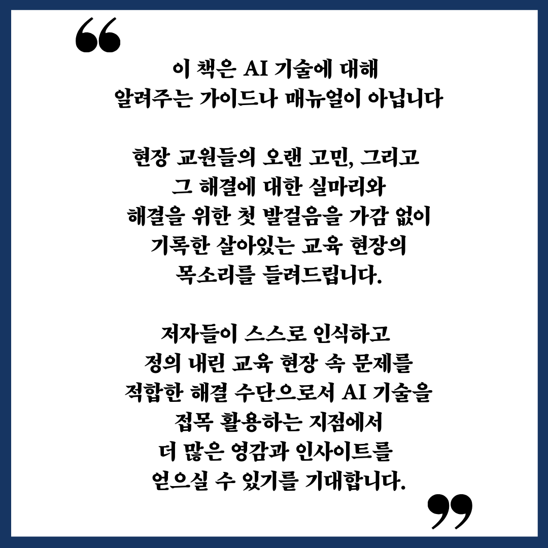 학교 선생님의 교육에 대한 고민을 AI로 풀어낸 책이 나왔다. 11분이 공저한 <챗GPT 시대 교유, AI로 풀다> 책이다. 상담, 발명, 작문, 작곡, 논문, 영어 회화, 생활기록부에 대한 고민이 있다면 이 책을 적극 추천한다. 정답을 얻으면 좋겠지만, 뭔가 시작할 수 있는 인사이트를 얻을 수 있을것이다.