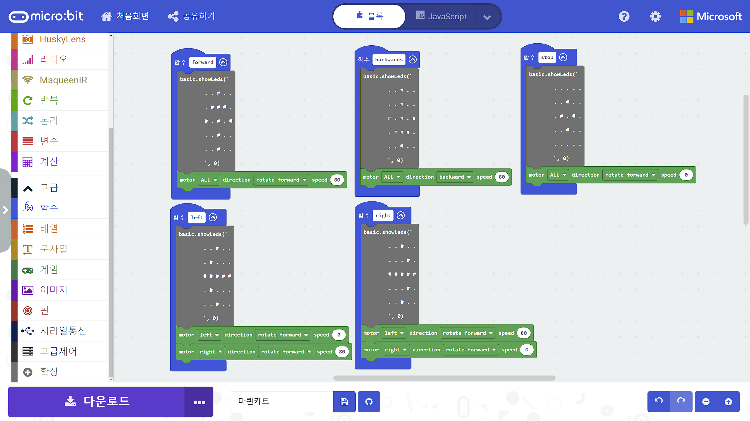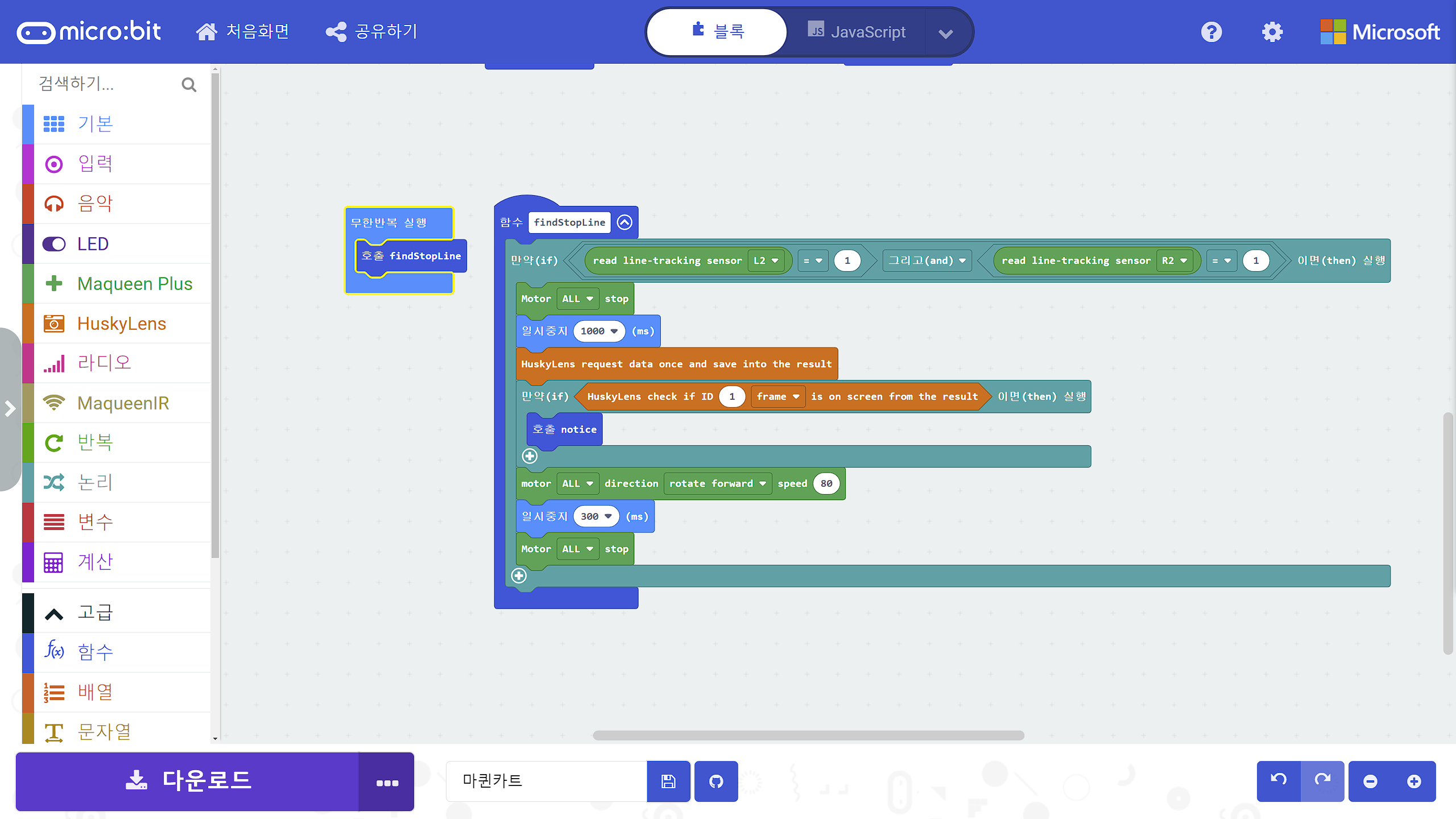 이 부분이 제일 아쉽다. 메이크코드로 작성할 수 있는 프로그램의 크기가 있는데, 마퀸 플러스와 허스키렌즈 확장 프로그램을 추가하면서 줄었다. 그래서 LED, RGB LED, 음악 부분은 다 뺐다.