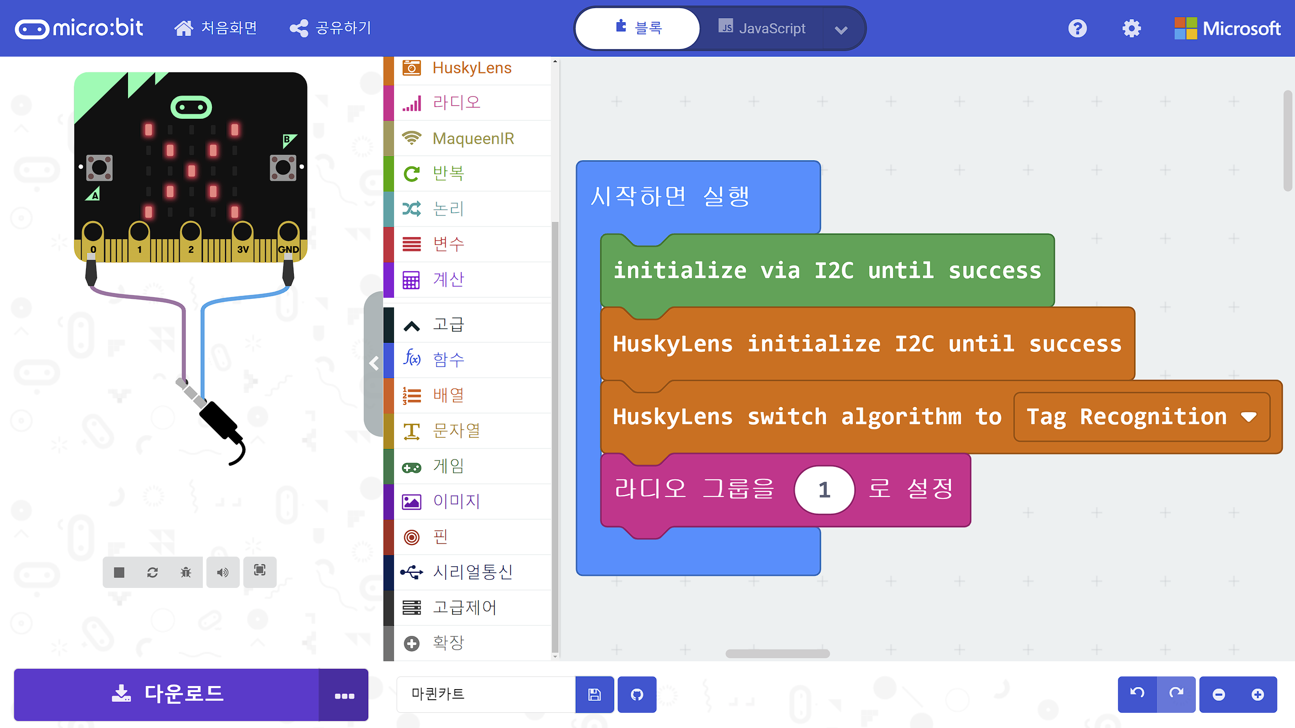 마퀸 플러스 & 허스키렌즈를 사용하기 위해 I2C 초기화를 하고, 허스키렌즈 알고리즘은 Tag Recognition로 설정한다. 마이크로비트 통신을 위한 라디오그룹을 1로 설정한다.